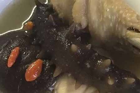 4、将鸡块、海参及姜片倒入砂煲中加入1升清水煲1小时。