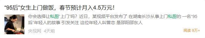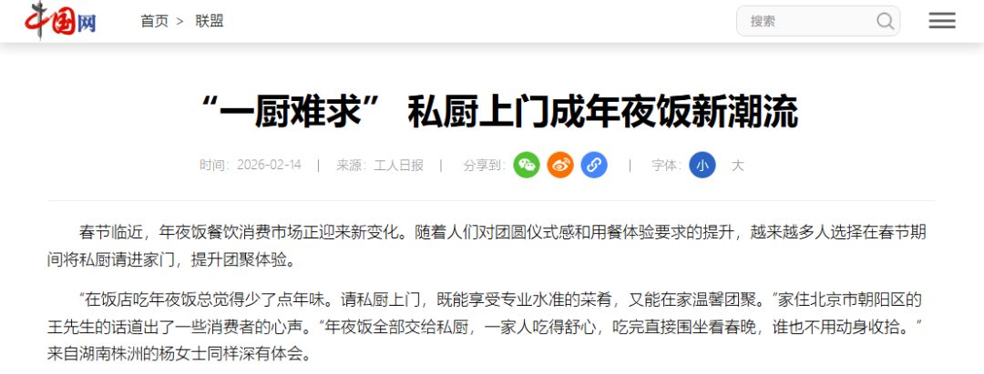 今年春节,“私厨上门”服务成为消费新热点。据《工人日报》报道,尽管费用上涨,服务仍“一厨难求”。央广网调查也显示,北京有私厨团队春节档期在1月就已全部排满。