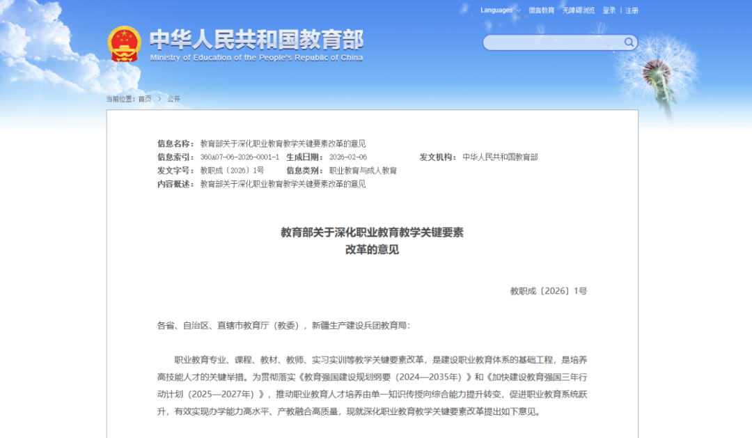 2026年2月4日,教育部正式印发《关于深化职业教育教学关键要素改革的意见》(教职成〔2026〕1号)。这份纲领性文件,为未来十年中国职业教育的高质量发展指明了方向、规划了路径、注入了强大动力。文件开宗明义指出,职业教育是与普通教育同等重要的类型教育,是培养大国工匠、能工巧匠和高技能人才的主阵地。