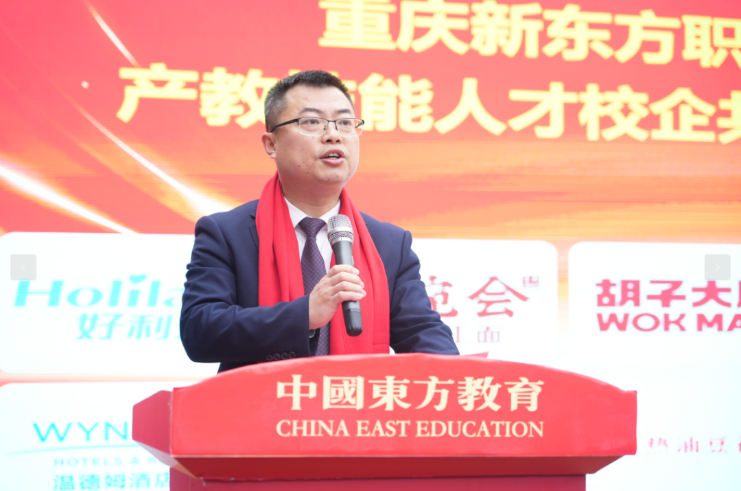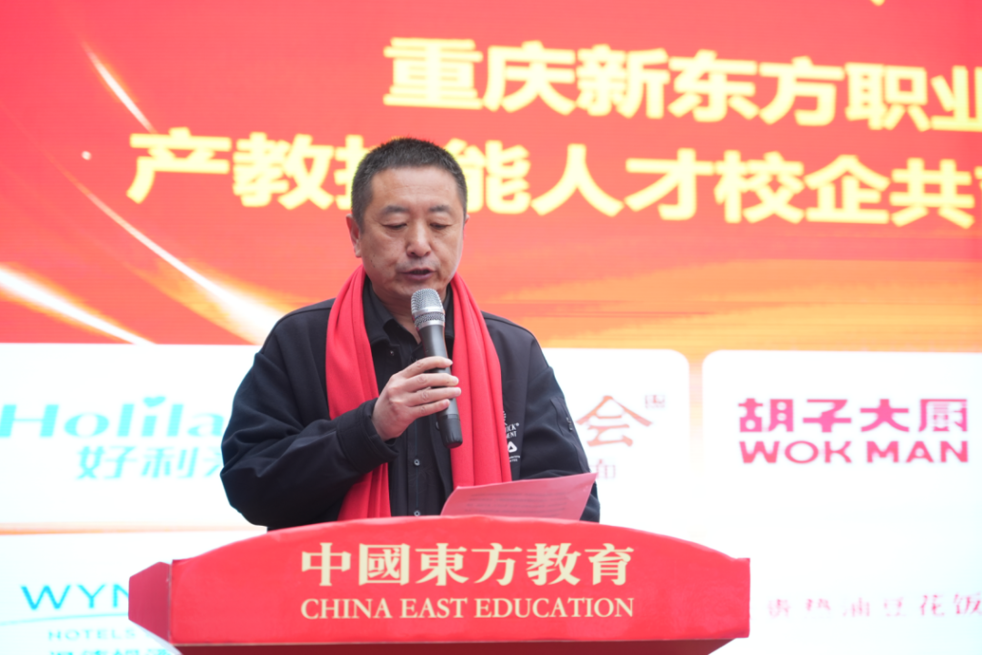 企业是人才的需求方,更是人才培养的参与者和受益者。北京好利来企业投资管理有限公司人事总监赵总作为企业代表发言。他指出,在产业快速升级的背景下,企业对技能型人才的需求日益迫切。产教融合模式让学生“在学习中实践,在实践中学习”,确保了知识与技能的市场契合度。好利来高度重视与重庆新东方的合作,不仅为学生提供实习与实训资源,更派遣技术骨干参与教学,将前沿技术、工艺与标准带入课堂,提前为企业发展储备优质人才。他鼓励学子们珍惜平台,锤炼技能,未来在岗位上绽放光彩。