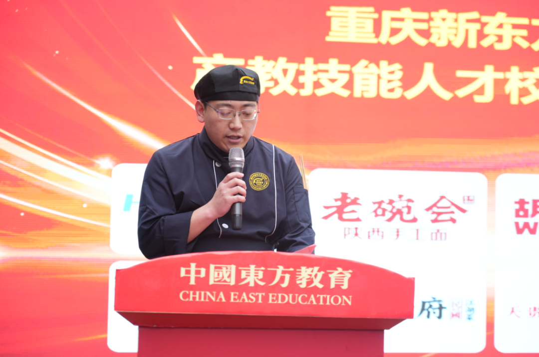 行政总厨2503班毕斯聃同学作为学生代表,分享了他的真切感受。他谈到,在重庆新东方的学习生涯,让他深刻体会到 “职业教育就是就业教育” 的独特优势。产教融合的“校企合作”模式,让课堂上的理论生动起来,让企业里的实践富有章法。这种“学中做、做中学”的历练,不仅让他掌握了扎实的烹饪技能,更让他对职业发展有了清晰规划,学会了团队协作与应对挑战。他代表全体同学感谢学校与企业的培养,并号召大家脚踏实地,用技能点亮人生,用奋斗书写未来。