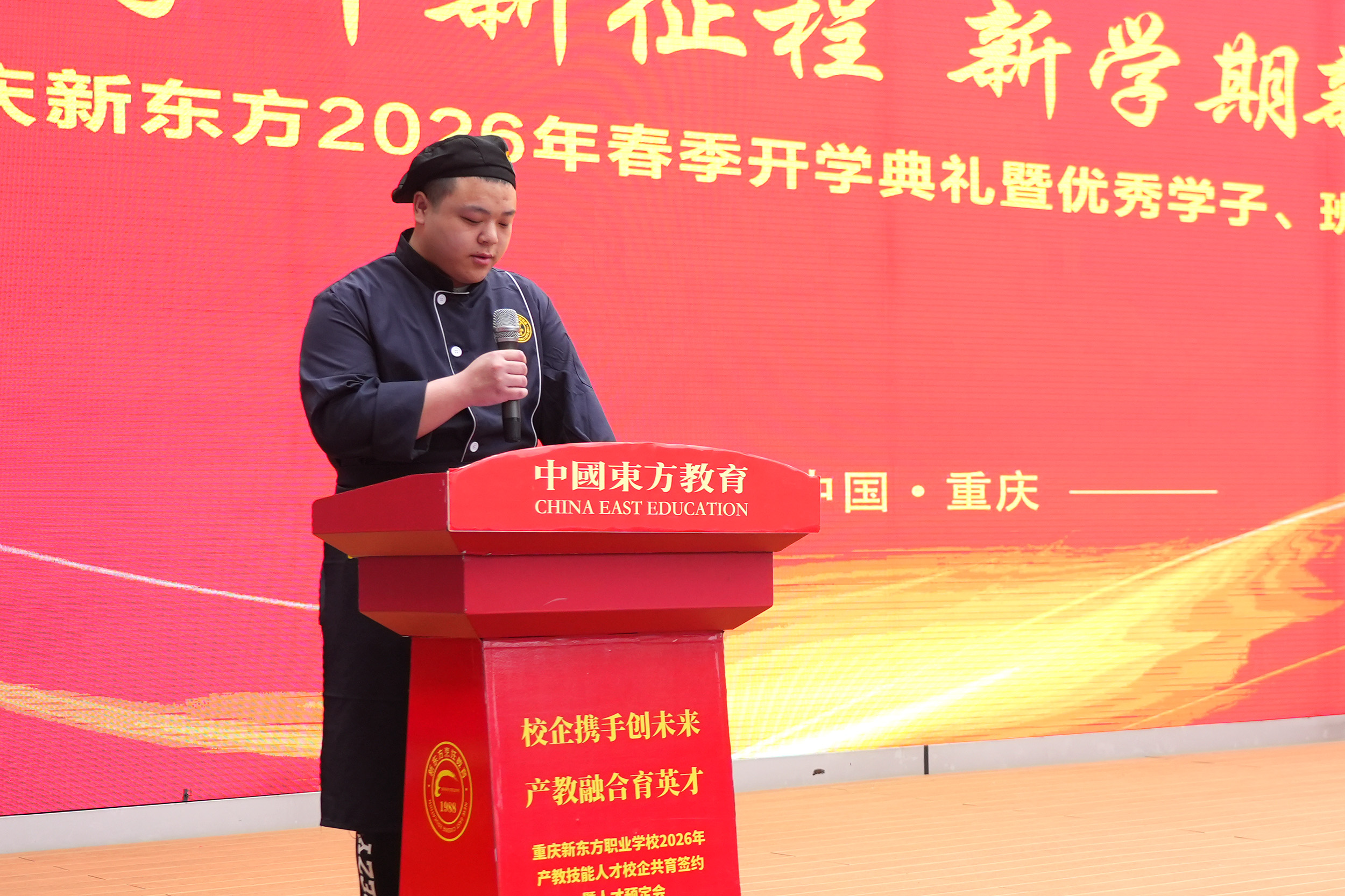西点专业的唐杨舜同学作为优秀学生代表上台发言。他表达了对新学期新知识的憧憬,并号召全体同学:“忘记昨日的成功与失败,要相信未来在我们手中!我们应该以全新的姿态来到校园,充满信心地面对今后的学习与生活。” 他展现了新东方学子朝气蓬勃、敢于挑战的精神风貌,以及始终怀揣的感恩之心。