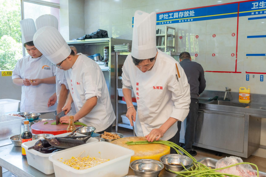 考核现场紧张有序、氛围热烈,学员们全神贯注、沉着应考,以扎实功底迎接实战检验。案板前刀光利落,食材被切配得均匀规整,尽显基本功底;灶台前炉火升腾,炒锅翻飞间,乡村基经典菜品的风味与质感被精准呈现。学员们将产教融合班所学的门店标准、实操技法、出品规范融入每一个环节,用一道道匠心菜品,交出学习成果的硬核答卷。