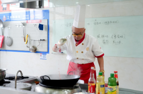 教学现场,龙云厨师长身着专业厨师服,头戴标志性高帽,在操作台前娴熟演示。白板上清晰标注着"宫保味""咸鲜味"等味型要点,调料台上整齐摆放着大红浙醋等各类调味品。龙厨师长一边操作一边讲解,从火候把控到调味技巧,每一个细节都倾囊相授。学员们认真记录,专注观摩,前排的大屏幕实时展示操作细节,确保每位学生都能获得最佳学习效果。