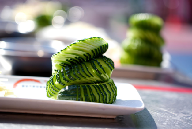 蒙眼蓑衣黄瓜与文思豆腐项目尤为精彩。蓑衣黄瓜需下刀深浅一致,提拉不断,舒展自如;文思豆腐则在方寸之间展现极致刀工,豆腐入水顷刻绽放如花。整个赛场节奏有序,选手们将平日苦练的汗水,凝结为一件件砧板上的艺术。