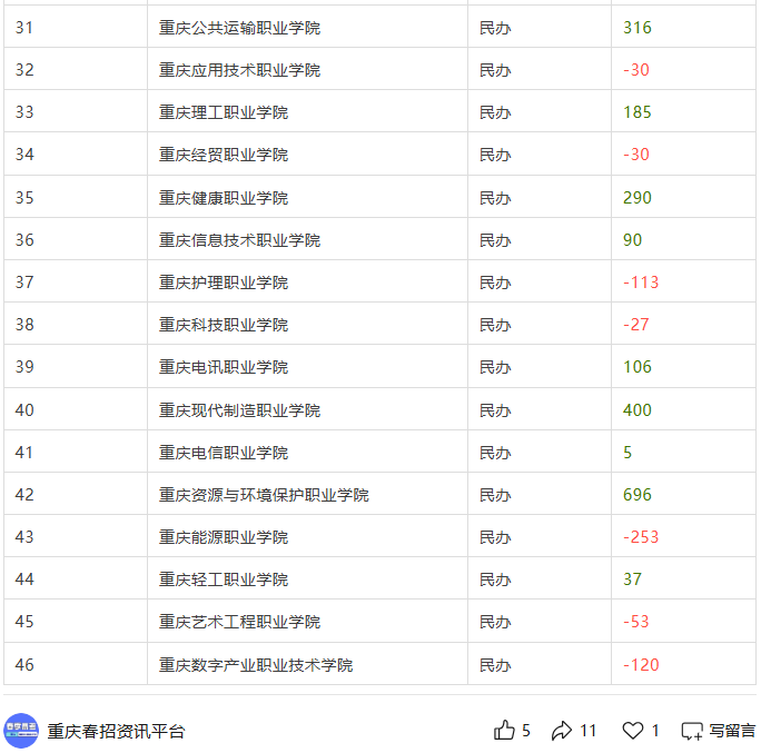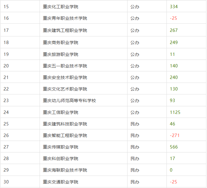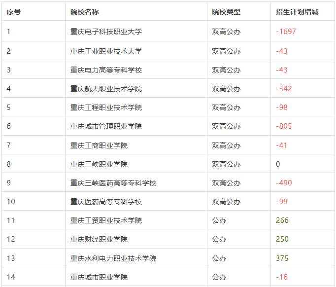 与此同时,部分院校招生计划有所增加,如重庆工贸职业技术学院增加266人,重庆财经职业学院增加250人。但增减相抵后,公办院校招生规模仍呈收缩状态。
